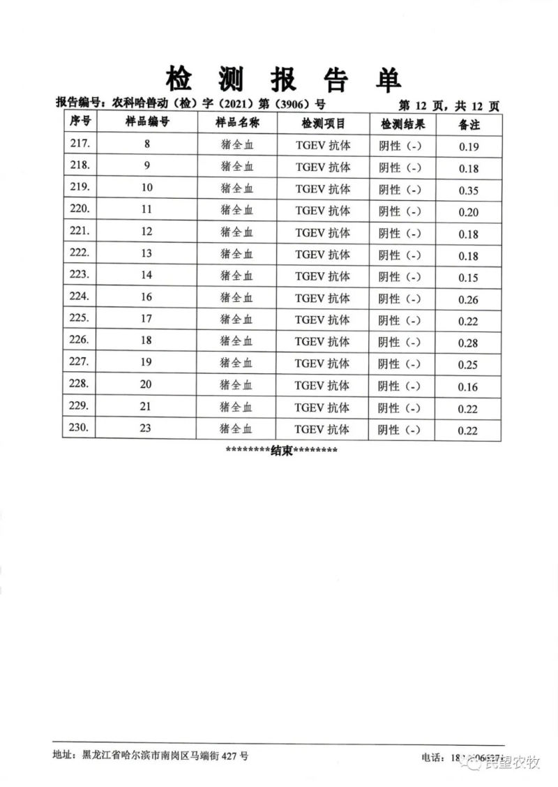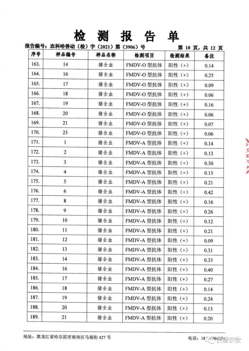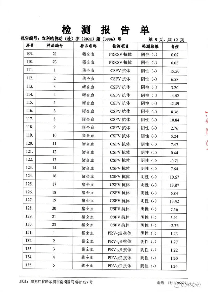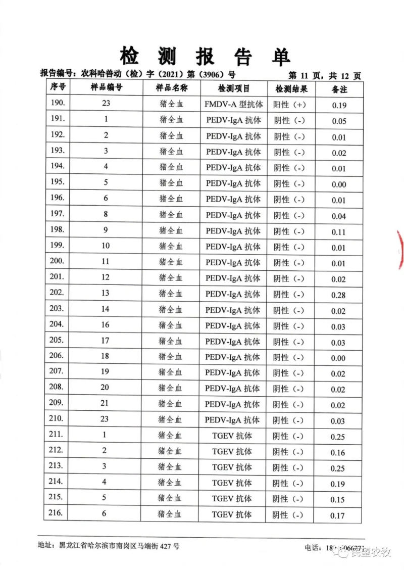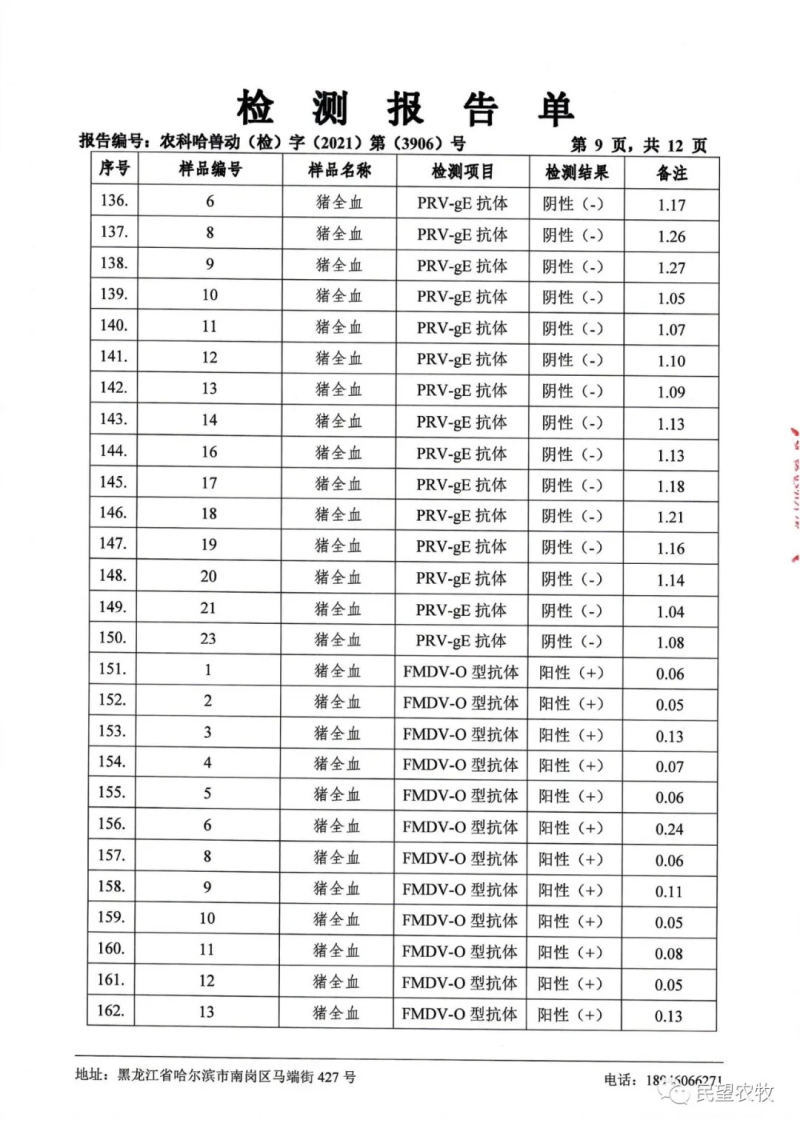 民望農(nóng)牧2021年9月份中國(guó)農(nóng)業(yè)科學(xué)院哈爾濱獸醫(yī)研究所檢測(cè)報(bào)告